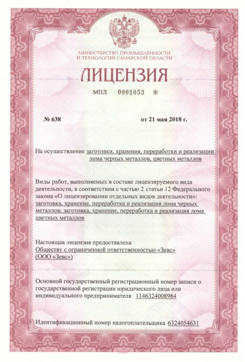 Лицензия на заготовку, хранение, переработку и реализацию лома черных металлов, цветных металлов